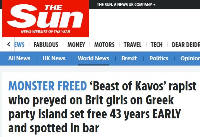 Από την πλευρά της η εφημερίδα Sun έγραψε χαρακτηριστικά: «Ένας κατά συρροή βιαστής με το παρατσούκλι »το Τέρας του Κάβου», που του αποδόθηκε αφού βίαζε κορίτσια από την Μεγάλη Βρετανία στην Κέρκυρα, αφέθηκε ελεύθερος 43 χρόνια νωρίτερα. Αλλά, αντί να βρίσκεται πίσω από τα κάγκελα για τα εγκλήματα του, ο ίδιος αφέθηκε σιωπηρά ελεύθερος, έχοντας κάνει 9 χρόνια φυλακή».