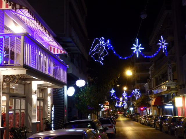 ΠΑΤΡΑ. Στο εμπορικό κέντρο της πόλης, οι διαβάτες λιγοστοί (lockdown), τα καταστήματα κλειστά αλλά πολλά φώτα ανοικτά...με εορταστική / χριστουγεννιάτικη διάθεση.